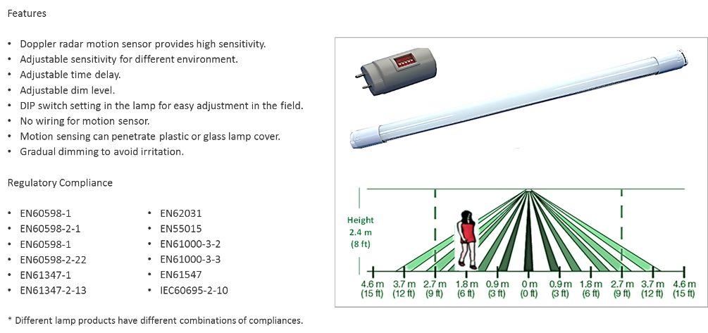 Lamps are fitted with integrated motion sensors. When someone walks near to the lamp it turns on automatically. After a time delay the lamps dims down for energy saving.